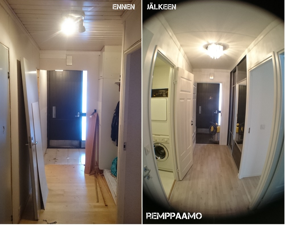 ETEISEN JA TUULIKAAPIN REMONTTI -Vanhat pinnat purettiin pohjustettiin ja maalattiin puhtaanvalkoisiksi -Vanhat harmaat laakaovet vaihdettiin karmeineen uusiin, tyylikkäisiin nelipeilisiin oviin. -Suuret säilytystilat piiloutuvat lasisten liukuovien taakse. -Tuulikaapin oviaukkoa kavennettiin 10cm ja lattialaatoitus uusittiin antrasiitin harmaaksi.
