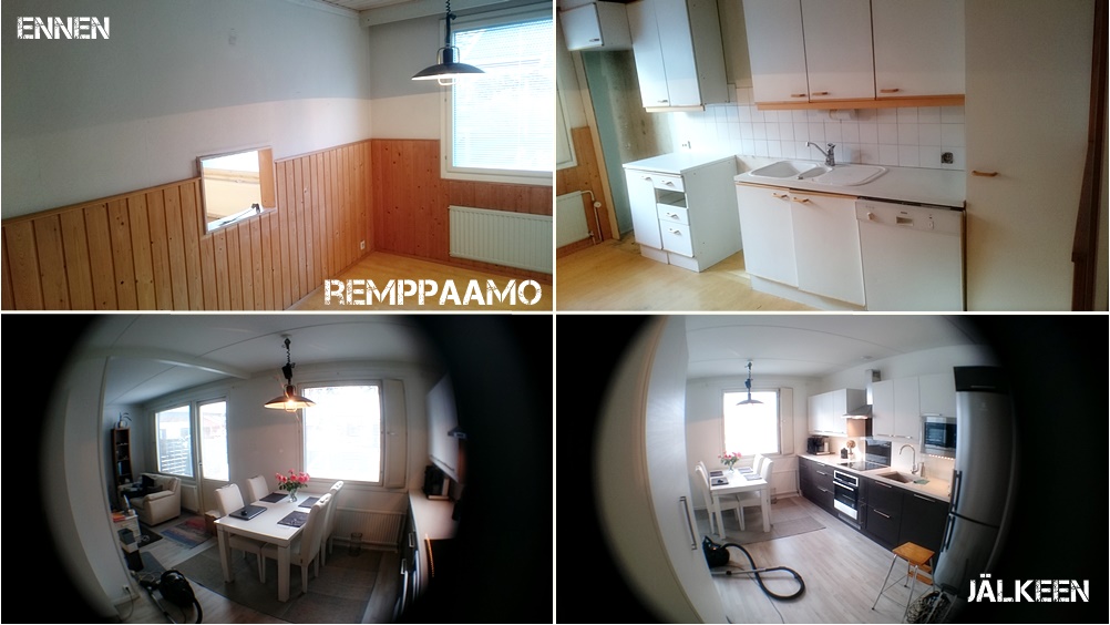 KEITTIÖREMONTTI -Vanhat kalusteet ja pinnat purettiin "luita myöten" pois. -Keittiön ja olohuoneen välistä purettiin reipas pätkä väliseinää pois, jolla saatiin aivan erikokoisen tilan tuntu, sekä keittiöön että olohuoneeseen. -Uusi kalustus, kodinkoneet, sekä pinnat saivat aikaan tyylikkään ja kotoisan keittiön.