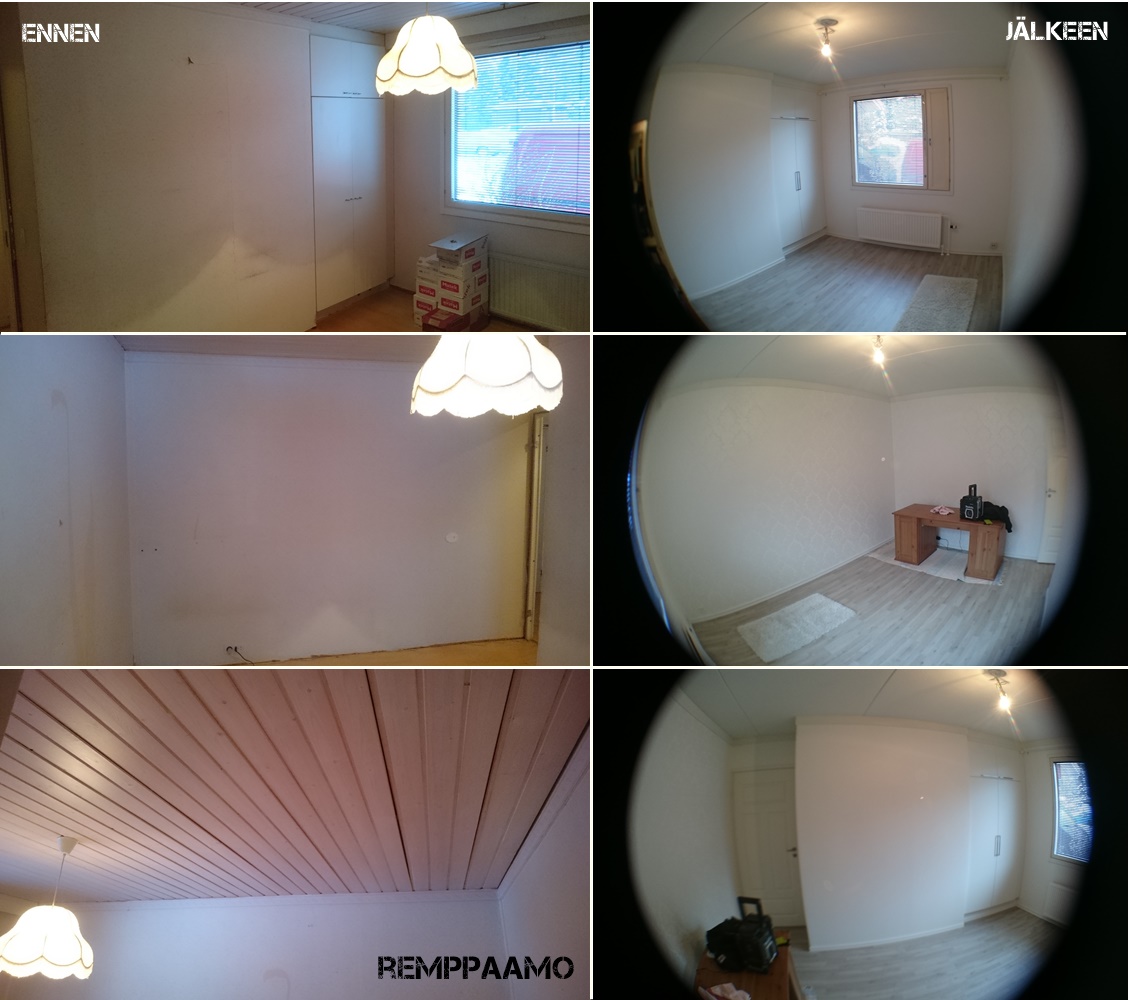 MAKUUHUONEREMONTTI -Vanhat tapetit poistettiin ja pinnat tasoitettiin, pohjamaalattiin ja pintamaalattiin, tai tapetoitiin. -Vanha rakoillut paneelikatto purettiin pois ja alta paljastunut betonikatto ehostettiin ja maalattiin uudelleen. -Lattiapinnat purettiin pois ja paikalle asennettiin uusi valkokuultoinen laminaattilattia. -Kokonaisuus kruunattiin kauttaaltaan uudella listoituksella. |