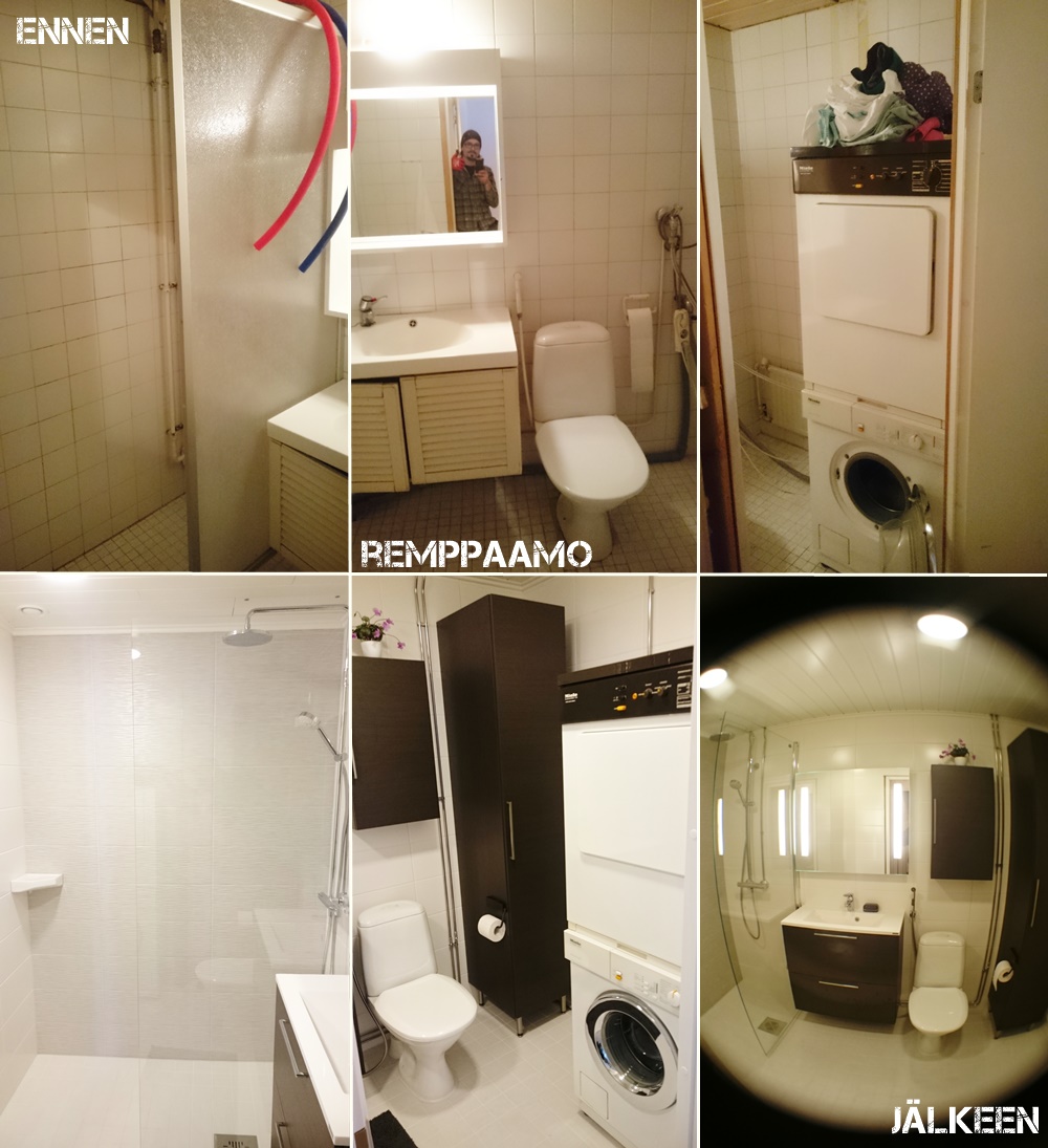 KYLPYHUONEREMONTTI -Kaikki pinnat purettiin pois valuille vesieristeitä myöten. -Kaivon paikkaa siirrettiin ja viemärit vedettiin rakenteiden sisään -Kevyisiin väliseiniin lisättiin kiinnityspuuta, levytettiin ja koko kylpyhuone vesieristettiin uudelleen -Uudet pinnat tehtiin kohokuvioisen suihkun tehosteseinän ja kalusteiden myötä moderniin, valoisaan ja muodikkaan suurikontrastiseen tyyliin. -Vanhasta ei kiintokalusteiden ja pintojen osalta jäänyt kuin WC-istuin, joka puhdistuksen jälkeen näyttää sekin uudelta. |