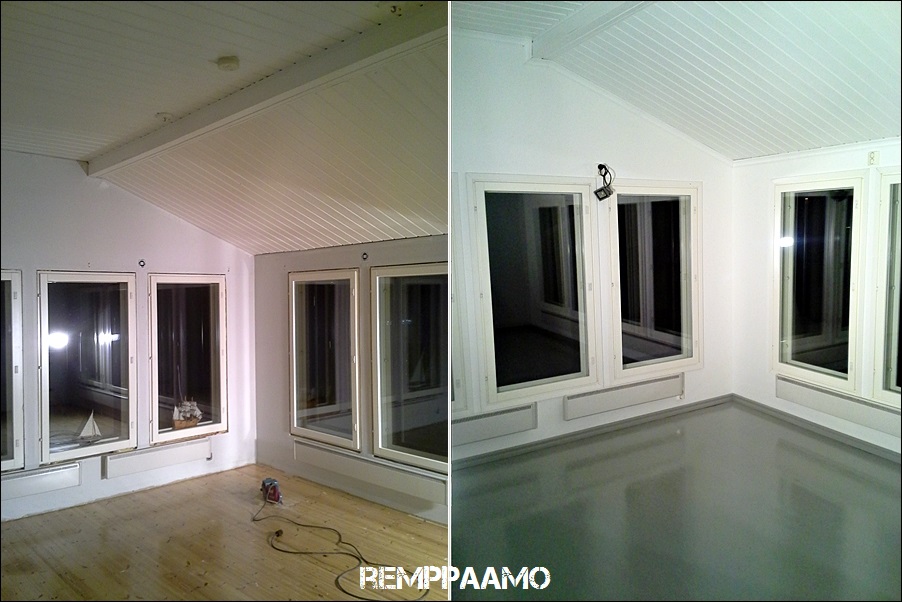 -Tämän olohuoneen remontti nykyiseen makuun päivitettynä sisälsi kaikkien pintojen uudelleenvärjäyksen. -Katto ja lattia olivat puun väriset ja seinät harmahtavat, joista kaikki muu muuttui valkoiseksi, paitsi lattia laastin harmaaksi.